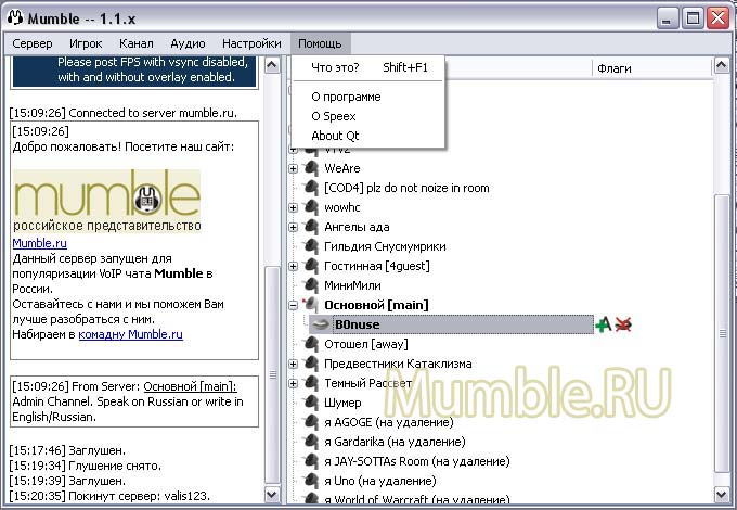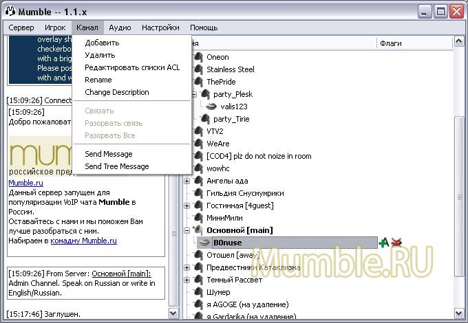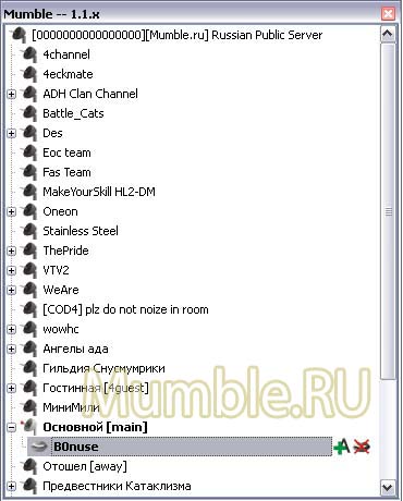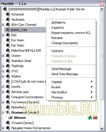 | Меню в Mumble представлено шестью пунктами: 1. Сервер С помощью этого меню можно Подключиться - подключиться к серверу Отключиться - отключиться от него Списки забаненных - посмотреть/изменить списки забаненных Information - увидеть информацию о сервере Quit Mumble - закрыть клиент Мамбл 1.1. Подменю "Присоединиться" состоит из двух вкладок и выглядит так: На вкладке "Custom Servers" находятся сервера, которые мы добавили в закладки. Тут же можно ввести свои данные в поля для подключения к определенному серверу. Label - отображаемое название сервера в списке Адрес - адрес сервера в интернете или его IP-адрес Порт - порт, на котором находится сервер Имя пользователя - Ваше имя на сервере (Логин) Пароль - пароль к Вашему аккаунту на сервере (используется, если Вы зарегистрированы на данном сервере) Вторая вкладка Server Browser содержит список Публичных серверов данной версии Мамбл. Через эту вкладку также можно подключиться к любому выбранному серверу, скопировать сервер на вкладку Custom Servers или перейти на Домашнюю страницу сервера. 2. Игрок Данное меню предназначено для управления подключенными пользователями (если у Вас есть на это права на сервере). Можно его использовать для управления собой. В зависимости от того, где в данный момент находится курсор в правом поле клиента, подпункты этого меню могут меняться. На другом пользователе: Выбросить - выбросить пользователя с сервера (сможет повторно подключиться) Забанить - забанить пользователя на сервере по IP и маске без возможности повторного подключения с данного IP Сделать немым - пользователь не сможет ничего слышать и говорить на канале Заглушить - пользователь не сможет говорить, но сможет слышать Местное глушение - только Вы не будете слышать данного пользователя. Применяется на других пользователях. полезно в те моменты, когда рядом нет Администратора. Send Message - послать сообщение данному пользователю На себе: Заглушить себя - звук от Вас в канал не будет передаваться (таким образом можно сказать другим, что Вы сегодня без микрофона или не можете говорить) Сделать себя немым - Вы не будете ничего слышать с канала и не сможете ничего сказать (например, когда Вы ненадолго отошли от компютера или у Вас нет колонок и микрофона) 3. Канал Это меню предназначено для управления каналом. В зависимости от Ваших прав на сервере Вы можете: Добавить - добавить канал/подканал. Удалить - удалить канал/подканал. Редактировать списки ACL - редактировать права зарегистрированных пользователей для выбранного канала/подканала, создавать и редактировать группы и их права (на этом пункте подробнее мы остановимся в другой теме). Rename - переименовать название канала/подканала. Change Description - изменить описание канала/подканала (по-другому, Приветствие канала). Информацию введенную в окне по этой ссылке будут получать все зашедшие на канал пользователи. Связать - связать канал (курсор в правом поле должен быть на определенном канале). Данная функция позволяет объединить выбранный канал для разговора с каналом, на котором находитесь Вы, т.е. пользователи на этих каналах смогут общаться между собой не переходя на один канал. Разорвать связь - разорвать связь между каналами. Функция обратная Связать. Разорвать все - разорвать все связи между каналами на сервере. Send Message - послать сообщение на канал. Send Tree Message - послать сообщение на канал и все его по