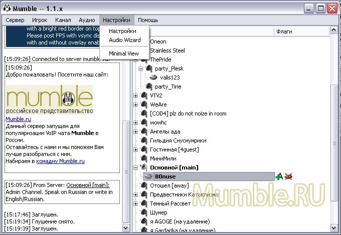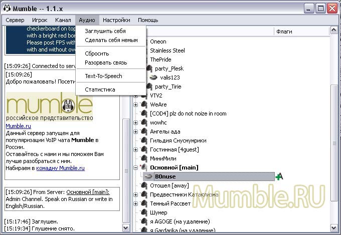 | Что включает в себя меню программы Mumble? |