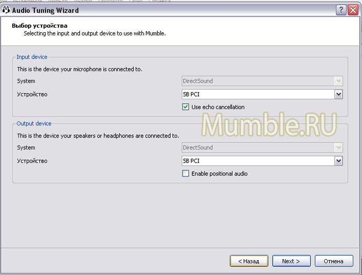 | При запуске Mumble открывается помощник настройки, также его можно вызвать в меню Настройки -> Audio Wizard Жмем кнопку Next Выбираем нашу звуковую карту и на выбор функции "отмена эха" и "позиционирование звука" Далее нам предложат подобрать минимальное значение буфера аудиокарты для оптимизации работы Mumble-клиента Жмем Next Следующим шагом будет настройка микрофона Нужно поставить бегунок так, чтобы все шумы были в синей зоне, а когда начинаем говорить – шкала звука выходила в зеленую зону. Если у вас шкала постоянно выходит в красную зону или находится постоянно в синей – настройте микрофон в системных настройках Вашего компьютера. Жмем Next и переходим к настройке режима активации голоса Думаю, лучше всего выбирать активацию голоса по кнопке (Push To Talk). Чтобы установить кнопку, необходимо 2 раза кликнуть левой кнопкой мыши в белом поле и нажать выбранную клавишу. И в завершении нам предложат поучаствовать в сборе анонимной статистике по Mumble, чтобы как-то помочь разработчикам. Определенную стастистику по использованию Mumble можно посмотреть тут http://www.sjuengling.de/mus/ Жмем Финиш. Если все сделано верно, то при нажатии выбранной клавиши нас будет слышно другим участникам конференции. |