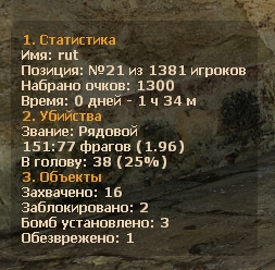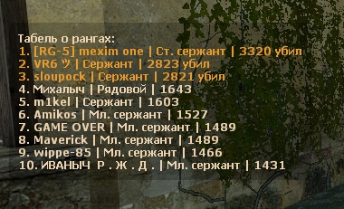 4)DoD:S Stats - Это плагин статистики! Давным давно я был ярым статистом и всегда мечтал создать "свою" статистику. Это специальная статистика для DoD:S с поддержкой SQLite и MySQL, DeathMatch и GunGame. В ней есть воинские звания, учёт установленных бомб, захватов, хэдшотов и прочего-прочего. Если Вы хотите, чтобы у Вас на сервере отображались русские звания, Вам необходимо будет или скомпилировать плагин по новой (лень делать описание), или скачать плагин отсюда (версия всегда актуальная)
