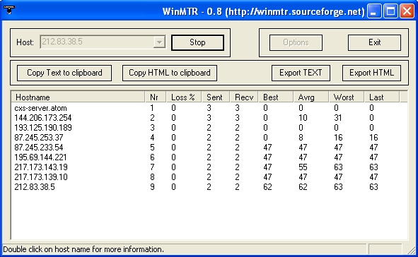 WinMTR - удобная программа для трассировки маршрутов к различным серверам. Позволит посмотреть потери пакетов и пинги по каждому узлу в реальном времени. |