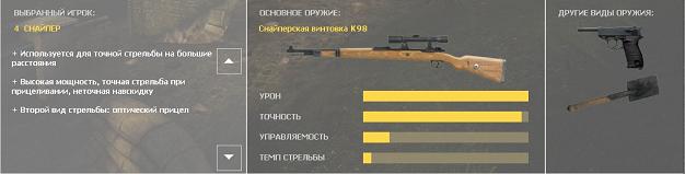 – дело непростое. Разработчики решили эту проблему, сместив наносимый урон от выстрела в сторону менее скорострельного маузера. Теперь, теряющий часть энергии выстрела на перезарядку «гаранд», наносит 80% урона и при поражении в корпус требует вторичного попадания (правда уже всё равно какого). Немецкий же «К98» как и прежде убивает при попадании в грудь одной пулей а разница в скорострельности и уроне теперь заставляет игроков менять тактику в зависимости от стороны за которую они играют, что приятно разнообразит игровой процесс. Получается, что бой уже не сводится просто к нанизыванию на ствол фрагов. Теперь важным элементом становиться борьба за позицию, в которой оружие соперника окажется наименее эффективным. Также необходимо учитывать, что стрелок единственный кроме снайпера класс, способный стрелять через «зум» (физический прицел, а не только виртуальный крестик на экране), что повышает точность его огня на больших расстояниях и при стрельбе по врагу за укрытием (когда видна одна нога или часть головы). 2 Штурмовик Теперь о штурмовике. Это самый простой в освоении класс. Новички его предпочитают за непритязательность в требованиях к стрельбе. То