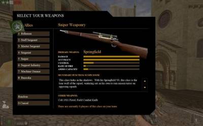 союзники, так называемый «BAR». В исторической реальности, мы имели бы принципиально различный подход к ведению боя. Дело в том, что бар имел как боеприпас полноценный винтовочный патрон и стрелять из него очередями с рук отваживался редкий богатырь Поэтому стреляли зачастую одиночными или установив на прилагавшиеся в отдельных вариантах сошки. «Штурмгевер» напротив, предполагал активное ведение боя, с частой сменой позиции и стрельбой без упора. «Stg 44» был оружием нового для того времени класса – штурмовых винтовок. А патрон, прилагавшийся к нему, назывался «промежуточным» или «облегчённым». Сегодня это основной тип боеприпаса к стрелковому оружию в любой армии мира. Во времена же первых двух мировых войн, основными считались винтовочные и пистолетные патроны. Казалось бы, в игре, возможны были другие варианты сбалансированного вооружения сторон. Ведь на вооружении Вермахта были автоматические «Fg 42» под винтовочный боеприпас, а США как вариант с промежуточным патроном – «M1 Carabine» (самозарядный и очень скорострельный). В новом DoD, мастера жанра решили по-своему. Различные по отдаче, поражающей способности и количеству патронов в магазине «автоматы», уровнены в точности и наносимом уроне, а весь баланс держится на отдаче! У «Stg 44» при стрельбе ствол сильно задирает вверх, а BAR стреляет с меньшей степенью этого эффекта, что иной раз делает его более удобным оружием на средних дистанциях и при стрельбе на ходу (атак с сокращением дистанции). В DoD сообществе считается что «поддержка» это основная ударная сила, что особенно заметно на картах с большим количеством построек, а две ручные гранаты, которые боец выкидывает без подготовки, делают его чрезвычайно опасным при обороне ключевых точек (флагов). 4 Снайпер Следующим, является классический для «шутеров» класс – снайпер.